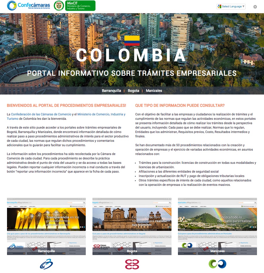 El sistema eRegulations ha sido implementado de manera piloto por tres Cámaras de Comercio en Colombia (Barranquilla, Bogotá y Manizales). Presenta los trámites paso a paso, desde el punto de vista del usuario y con todos los detalles necesarios (nombre de los funcionarios, requisitos, formularios, costos, tiempos, etc.). Permite al publico consultar las normas y ver de que manera están interpretadas y aplicadas por las administraciones.