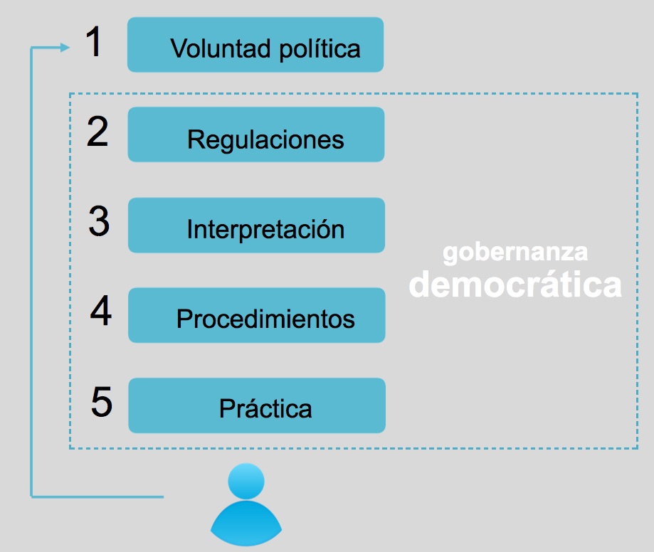 Estas láminas muestran la diferencia entre la gobernanza democrática, donde los administradores públicos aplican de manera neutra y eficiente las decisiones del poder político, y la gobernanza burocrática que las altera.